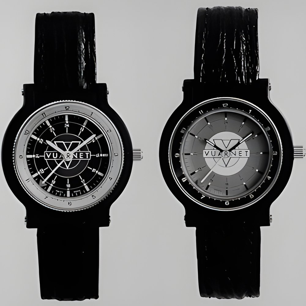 Vuarnet’s “Wake Up” wrist alarm watch serves as a practical appointment reminder system. ETA Swiss Quartz movement, centre alarm hand, fibreglassreinforced synthetic (ARNIT) case. Steel bezel with aluminium ring bearing minute divisions. Mineral crystal. Sharkskin strap. (VUARNET “Wake Up”)