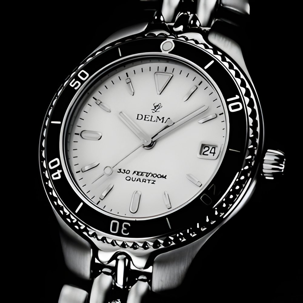 Delma now presents its new “Portofino Marine” diver’s watch. Very representative of the “Portofino” line, it features flawless finish, a solid stainless steel case, a IDS-treated watch crystal. astute braceletto-case attachments and an ETA quartz movement. It is water-resistant to a depth of 200 m and is equipped with a unidirectional rotating bezel. (DELMA “Portofino Marine”)