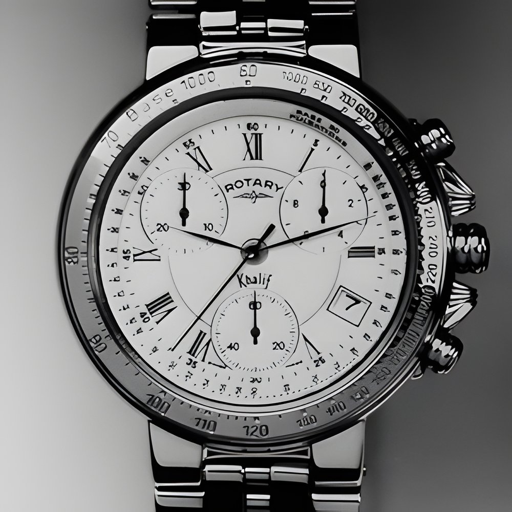 Rotary’s Khalif collection comprises 12 designs ranging from men’s and women’s styles with Flatline quartz movements providing hours, minutes, seconds and date to ETA Quartz chronographs with 10-micron goldplate two-tone cases water-resistant to 50 m, sapphire crystal, metal bracelet with concealed folding clasp. Rotary signature at 6 o’clock on the bezel and on the crown guard. Registered design. (ROTARY “Khalif”)