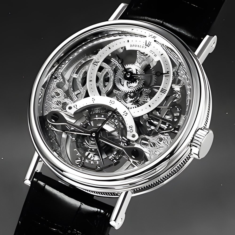 One’ of horology’s most distinguished achievements in nearly two centuries now, Breguet’s tourbillon regulator adopts new dimensions expressed in this man’s openworked “skeleton” movement in 18K yellow gold. Case with fluted flanks and transparent sapphire back. 13-line, hand-engraved nickel silver movement, individually numbered and signed. Roman hour numerals and engine-turned silver gilt sectorial seconds indicator with Arabic numerals. One-minute tourbillon carriage rotation. Adjusted in all six positions. (BREGUET)
