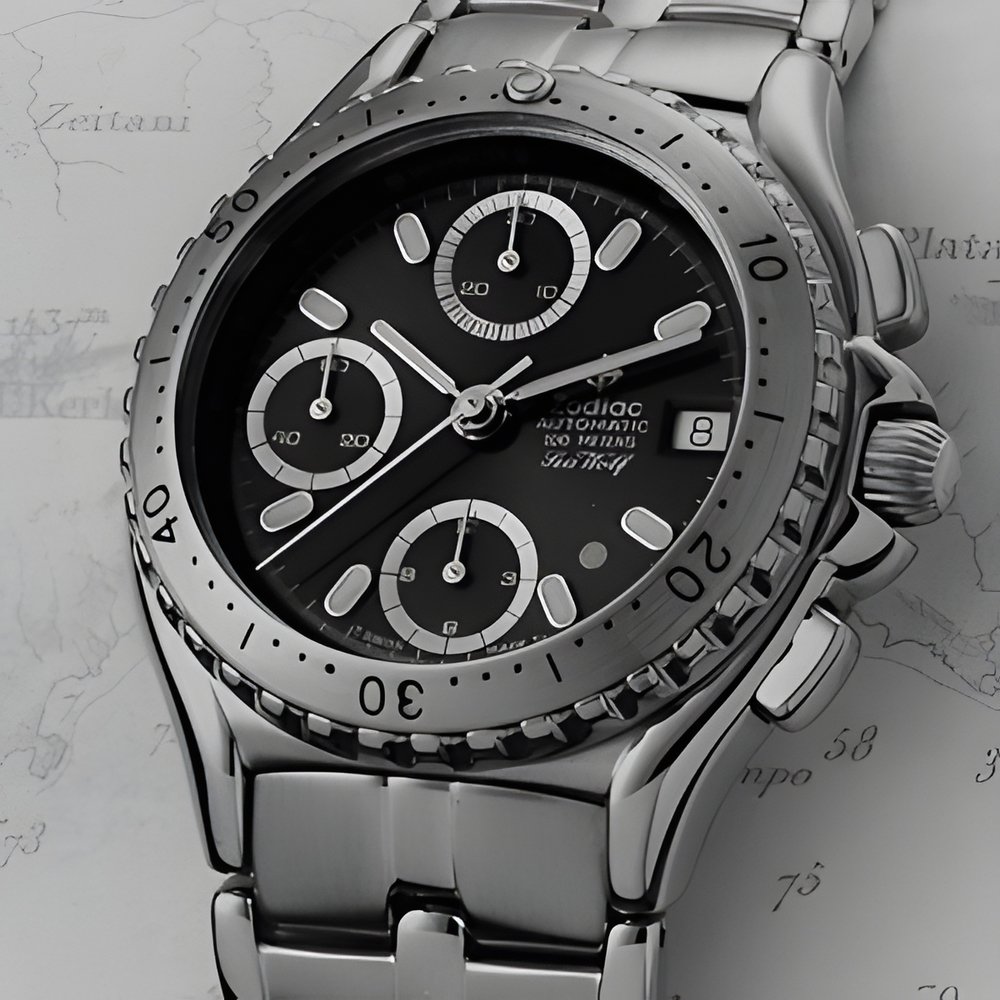 Zodiac’s Seawolf chronograph with Valoux 7750 selfwinding movement is available in three variants, water-resistant to 100 m : all-steel, two-tone or totally goldplated. Shaped pushpieces, sapphire crystal, screw-locked crown. Dial with tachymetric scale inscribed on the flange. Rotating bezel with pressed-in steel ring engraved with 0-60 markings, tritium dot at 12 o’clock protected by a sapphire lens. Metal bracelet or leather strap, with safety clasp fitted on the folding buckle. (ZODIAC “Seawolf”)