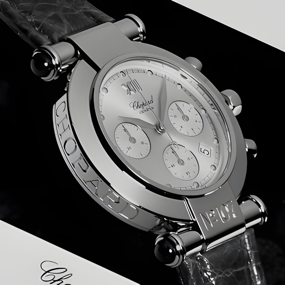 Chopard Cenève’s new “Imperiale” seifwinding chronograph records hours, minutes and 1/5th seconds. It also includes a small seconds subdial and a date calendar in 18K pink gold. Case with screw-locked crown, water-resistant to 30 in. Seven ruby cabochons (weighing 2.70 carats) are set in the bracelet attachments, the pushpieces and the setting crown. Red alligator strap with engraved clasp. (CHOPARD GENEVE “Imperiale”)