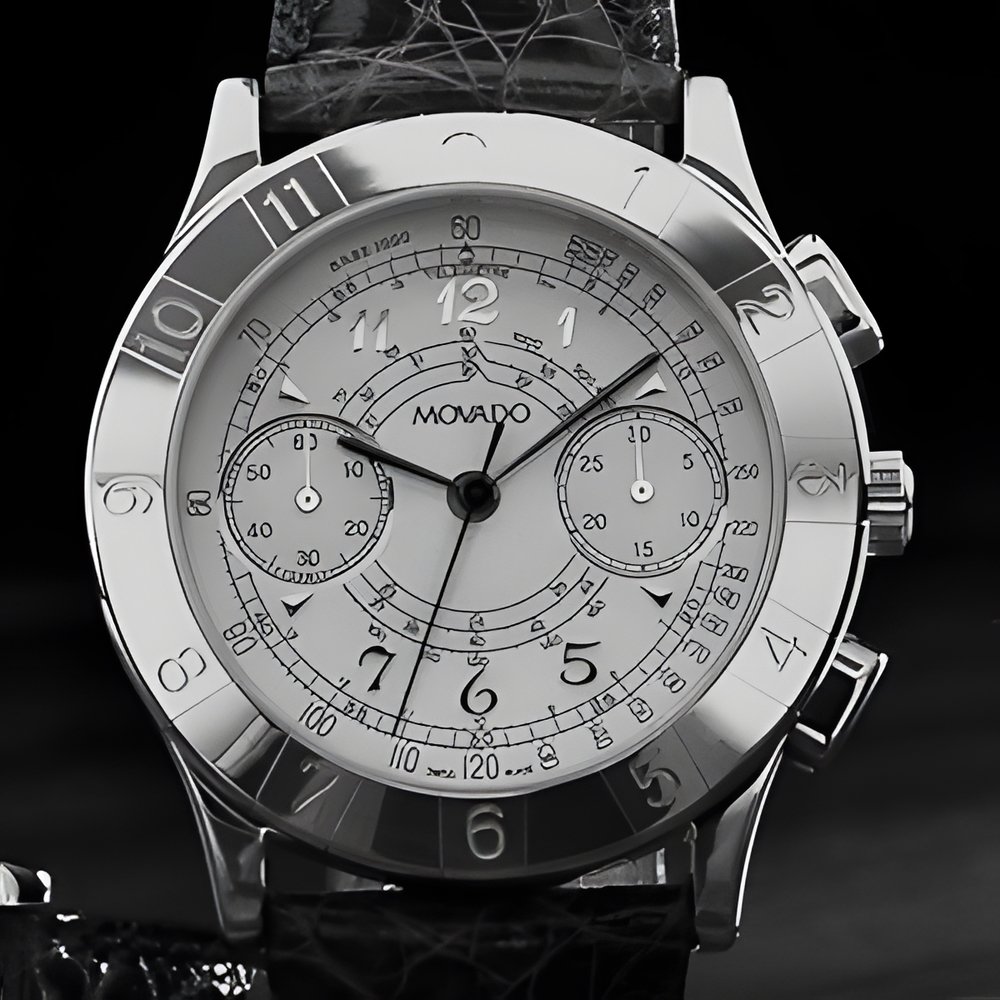 The most recent entries in Movado’s “Collection 1881” are equipped with a selfwinding movement housed in a stainless steel case water-resistant to 50 m and featuring a bezel with 12 pink gold inlays. Left : powerreserve indicator, 24-hour display plus day and date calendar. Right chronograph with telemetric and tachymetric scales and both 30-minute and 60-second totalizers, a replica of a successful Movado design of the late 1940’s. (MOVADO “Collection 1881”)