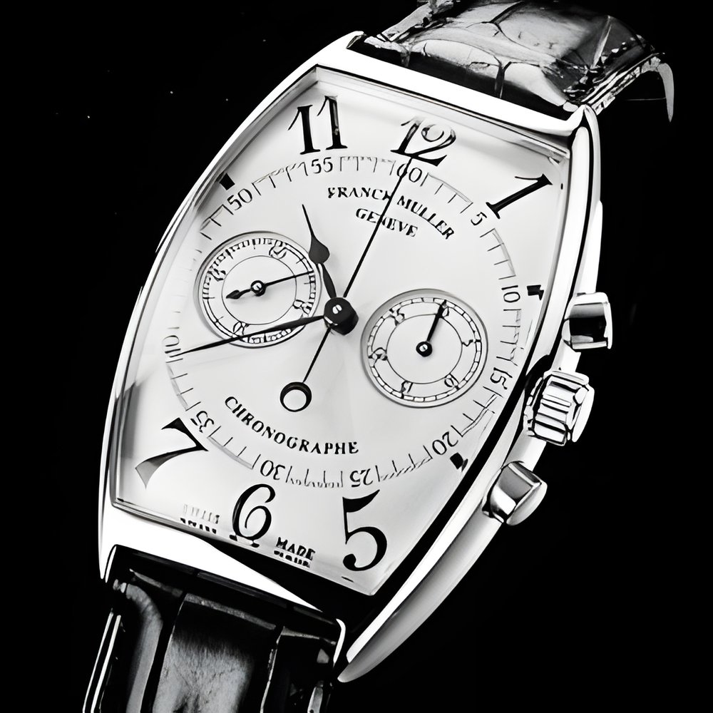 Featuring a 30-minute totalizer, this new chronograph displays a square, incurved case available in white, yellow, pink and red gold as well as in platinum. Its silvered, engine-turned dial and “Stuart pear” style blued steel hands stress this design’s definite “period” look. (FRANCK MULLER)