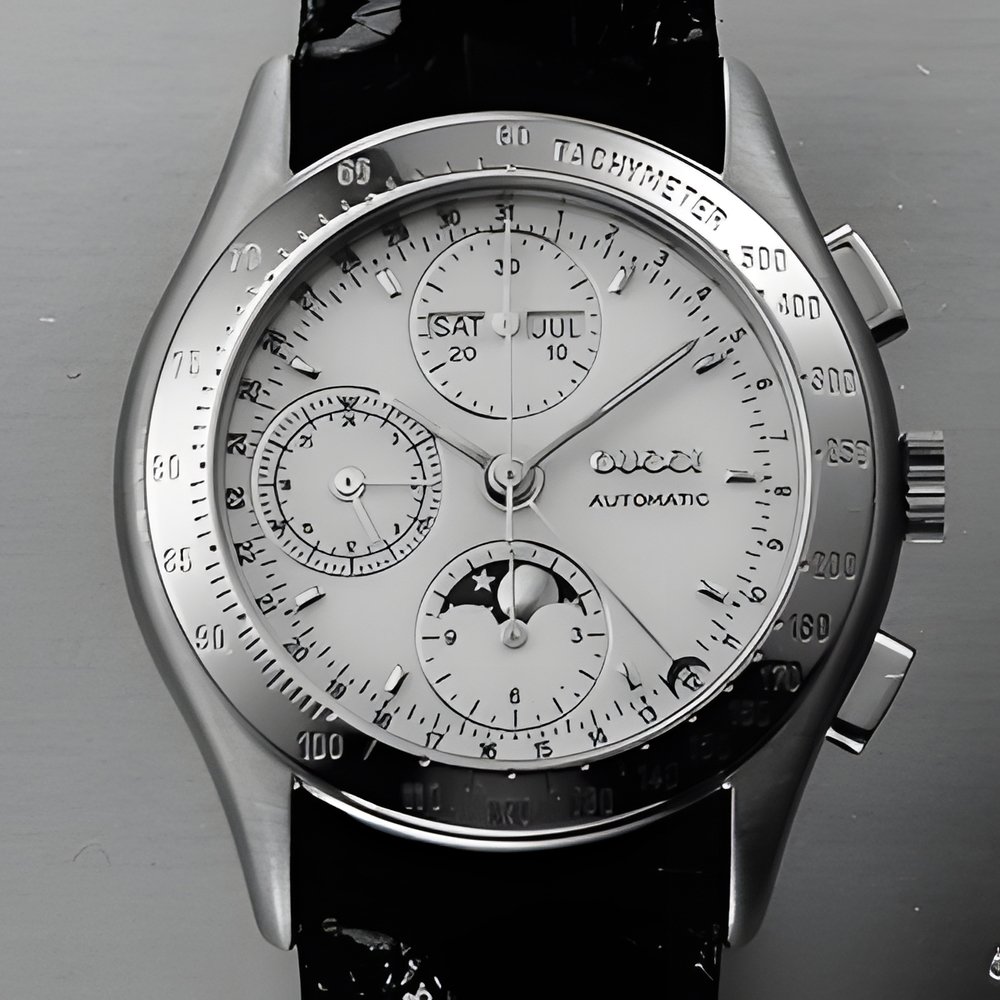 Derived from Gucci’s Model 730, the new chronograph “730M Automatique” design reflects current trends : stylish, sports-spirited look, seifwinding movement. Case water-resistant, polished bezel with engraved tachymeter indicator, indication of the hours, minutes and small second. Chronograph functions with 30 minutes’ and 12 hours counters. 24 hours hand, date indication by hand, day and month indications as well as moon phases showing in dial apertures. Crafted ¡n 18K gold, with domed sapphire crystal and transparent case back (sapphire), this model exemplifies the ever more pronounced refinement and technological development of the Gucci “18 Karat Gold Collection”. Genuine alligator strap. (GUCCI - Chronograph “730M Automatique”)