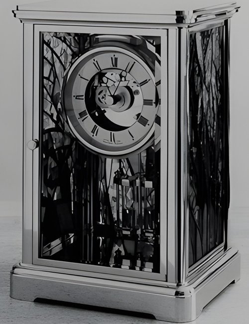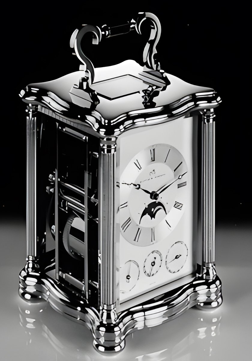 This stylishly designed officer’s clock from the new “Classique” collection is fashioned from polished solid gold brass fitted with bevelled mineral-glass panels. 8-day mechanical movement with strike, repeater device and alarm mechanism plus date calendar and moon-phase indicator. (MATTHEW NORMAN “Classique”)