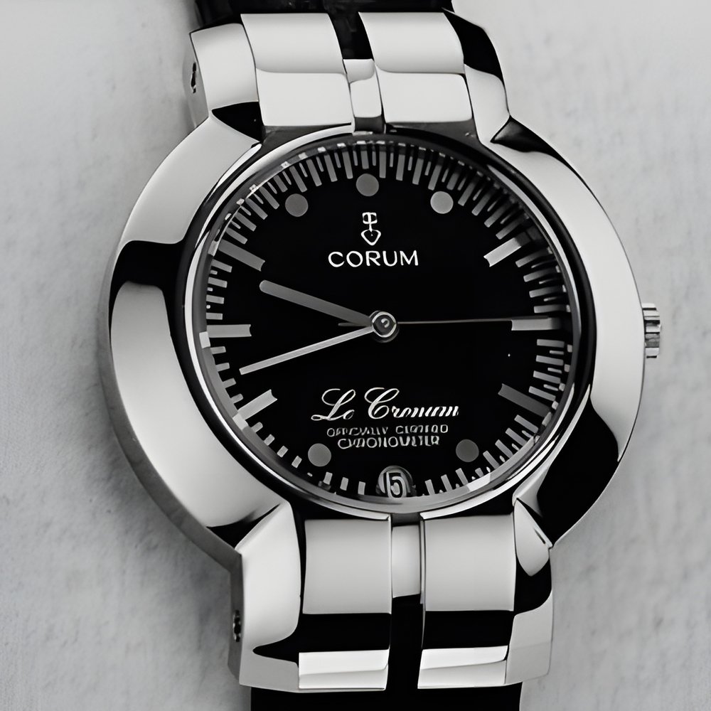 “Linea C” is the name of Corum’s latest design family, whose initial entry is “Le Cronum”, a chronometer equipped with a seifwinding movement whose precision is attested by an official certificate. Available with solid 18K gold or steel case, water-resistant to 60 m. Its back bears a gold medallion engraved with a choice of symbols including a gearwheel, an hourglass or the mark of infinity, along with the Greek words “Kronos Metron” (Time Measurement). Registered model. (CORUM “Le Cronum”)