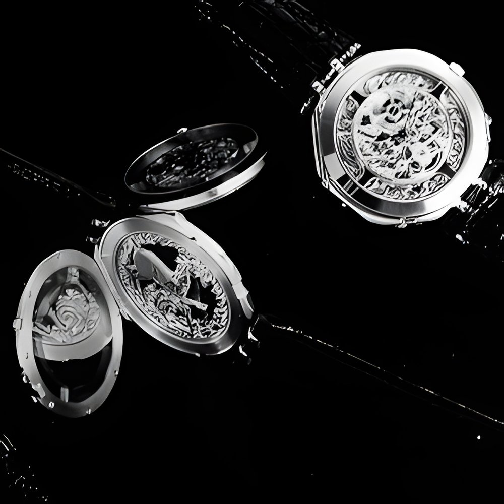 This twin-faced 18K “Janus-Magic Moon” design is set with 45 diamonds. It is equipped on one side with an openworked “skeleton” mechanical movement and a quartz-piloted one on the other, enhanced with a tailor-made moving pattern. A chased or engraved rotating decorative element made to the purchaser’s specifications is positioned in its centre. (SARCAR “Janus-Magic Moon”)