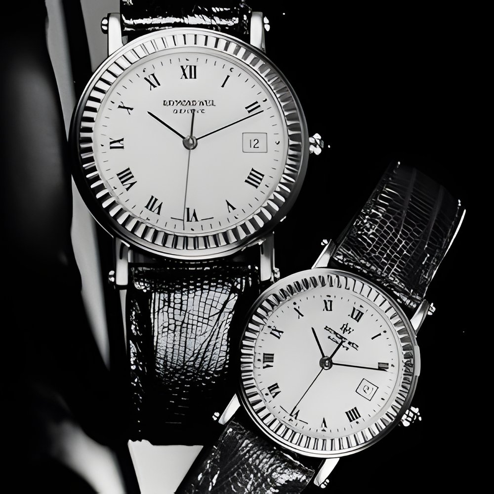 A pair of models from Raymond Weil’s “Classic Collection”. All-steel cases water-resistant down to 30 m, fluted bezels in 18K gold, cabochon-tipped crown and decorative pattern on the horns. White dial with Roman numerals and beaded pattern or else blue or ivory finish with hour markers. Scratchresistant sapphire crystals. Quartz movement with date calendar and centre seconds hand. Teju leather strap in a choice of colours. (RAYMOND WEIL “Classic Collection”)