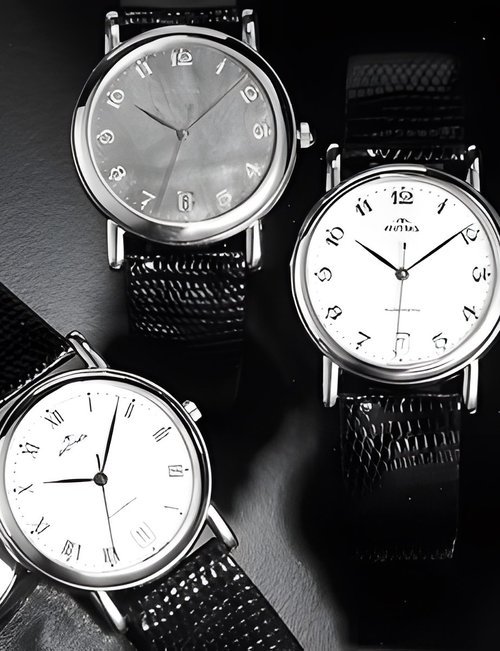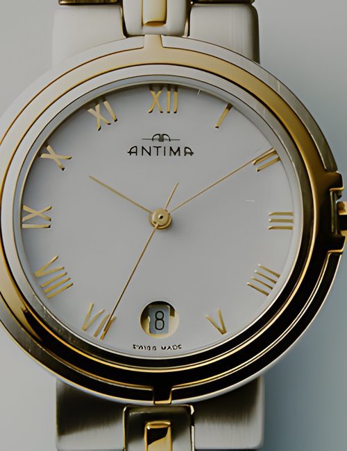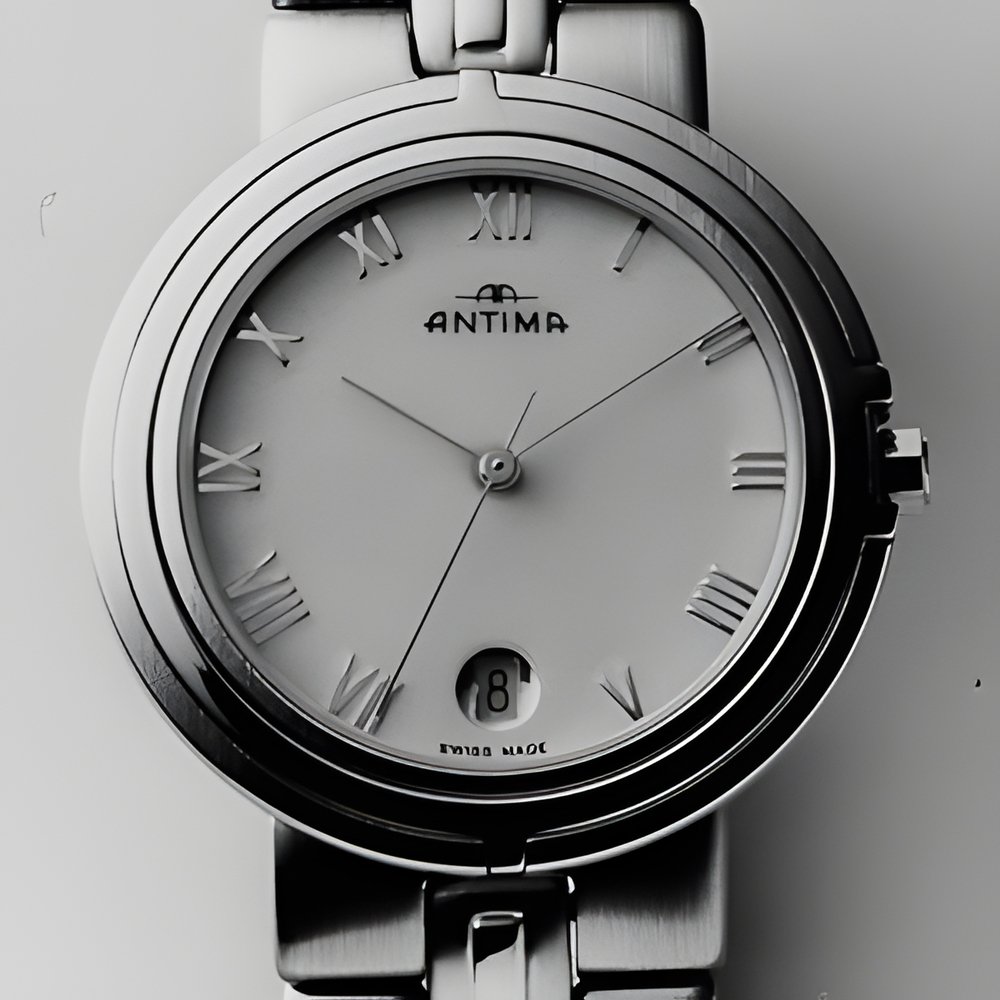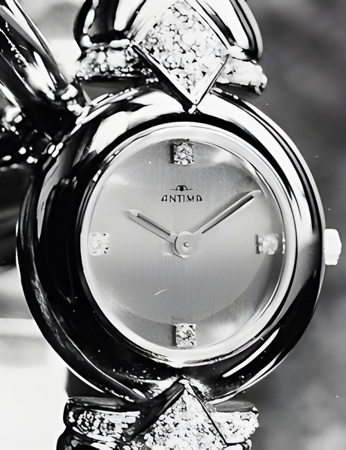“Futura II” is the name of a stylish sports watch designed for town and country wear - at home at a country club, at ease at a business dinner. Steel or two-tone styling featuring an applied, gem-set bezel that’s a perfect match for the bracelet. Also available with leather strap. Choice of hour markers or Roman numerals on the dial. (ANTIMA “Futura II”)