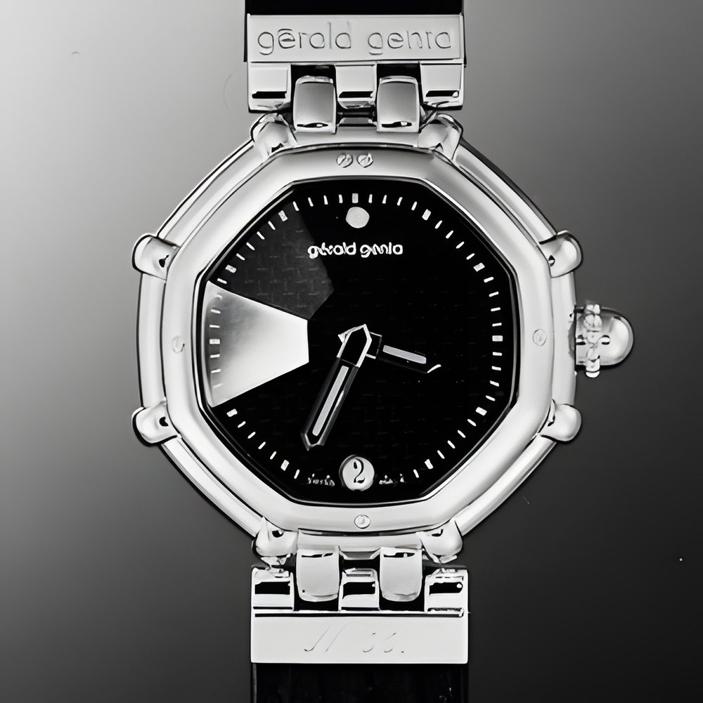 Gérald Gentals “Success” design has done so well that it is now issued with a leather strap. This new version naturally includes the design’s three exclusive patented features : 1° hands are made of faceted corundum and luminous; 2° the crystal’s underside is delicately faceted; 3° the dial is fashioned from carbon fibre, giving it a “vowen fabric” texture depending on the angle of reflection of light. (GERALD GENTA “Success”)