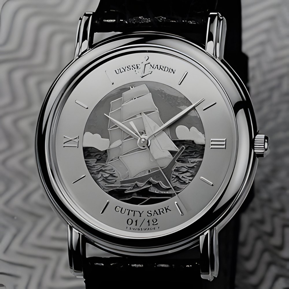 Ulysse Nardin’s “San Marco” model, an officially certified chronometer, revives an all-but-forgotten art, that of cloisonna enamel. The eyecatching “Cutty Sark” dial’s complete fabrication requires 54 separate operations, a dozen oven firings and a good hundred hours of work. Waterresistant, fitted with a sapphire crystal, it is available with a leather strap or a gold bracelet. (ULYSSE NARDIN “San Marco - Cutty Sark”)