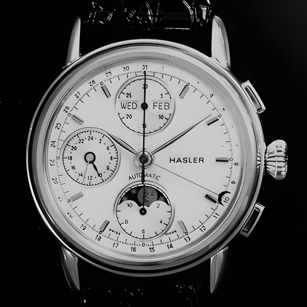 Selfwinding chronographs remain as popular as ever. This Hasler design’s 18K gold case holds a Valjoux 7751 13 1/4-line movement, with 60-second, 30-minute and 12-hour totalizers; day, month and moonphase apertures in the dial; pointer-type date calendar plus special 24-hour hand. (HASLER & Co. SA, Tramelan)