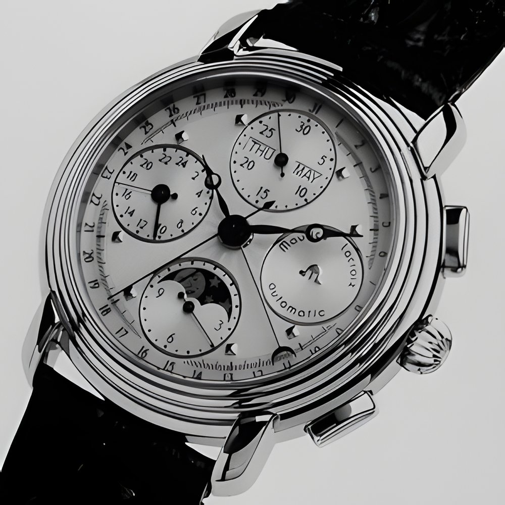 This year, Maurice Lacroix is introducing a selfwinding chronograph with Valjoux 7751 movement. It provides a 30-minute and a 12-hour totalizer, a permanent small seconds hand, 2k-hour (2nd time-zone) counter, pointertype date calendar, the days and months in a dial aperture and moon-phase indications. Steel case water-resistant to 30 m, with 18K yellow gold stepped bezel. Sapphire crystals front and back (visible movement). With individual registration number. (MAURICE LACROIX)