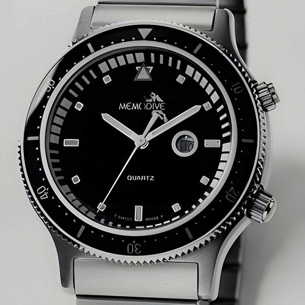 “Memodive” is a diver’s watch water-resistant to a depth of 200 m. Choice of seifwinding or quartz movement. Fitted with a quartz-controlled 60-min. timer for monitoring decompression times. All-stainless-steel case, one-way ratcheted rotating bezel, screw-locked crown and pushpiece. A truly professional timing instrument. (MEMOTIME S.A. “Memodive”)