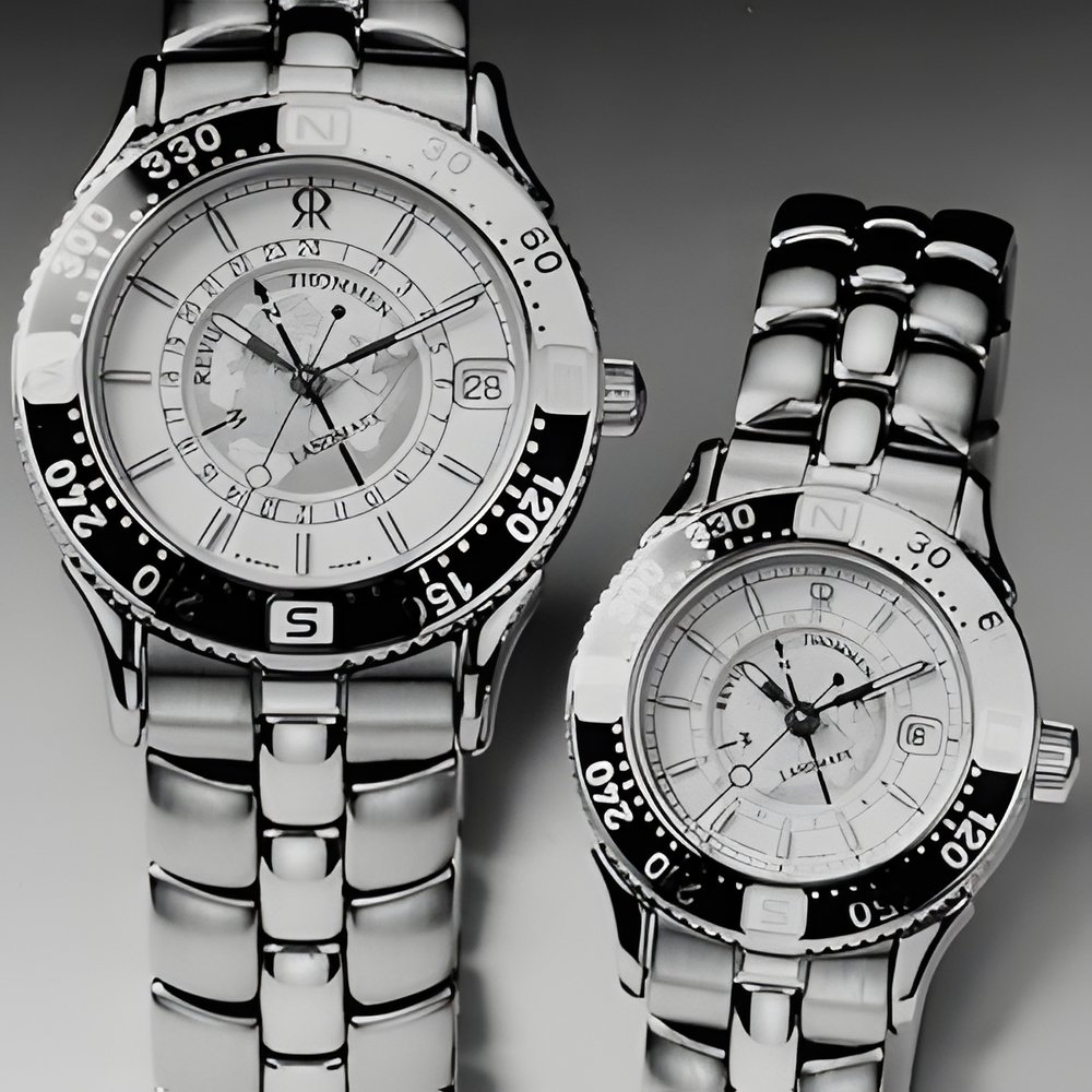 These “time instruments” combine a wristwatch and a solar compass. A rotating bezel with Chinese lacquer finish and engraved with the four cardinal points equips their all-steel case water-resistant to 200 m. A world map is finely delineated on the dial, protected by a scratchresistant sapphire crystal. Water-repellent sharkskin strap or choice of steel or two-tone bracelet. Proprietary quartz movement with 214.-hour function and solar compass. (REVUE THOMMEN “Landmark Trekking”)