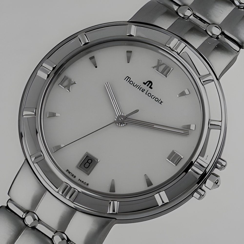 Each steel and 18k gold watch in Maurice Lacroix’s new Alhambra line for men and women bears an individual registration number. Water-resistant to 30 m. Quartz calibre with centre seconds and calendar. Choice of two dial styles : genuine mother-of-pearl with diamond markers, or white-lacquered with Roman numerals for quarters, three-quarters and hours. These trendy designs come with two-tone bracelet or genuine alligator strap. (MAURICE LACROIX, “Alhambra”)