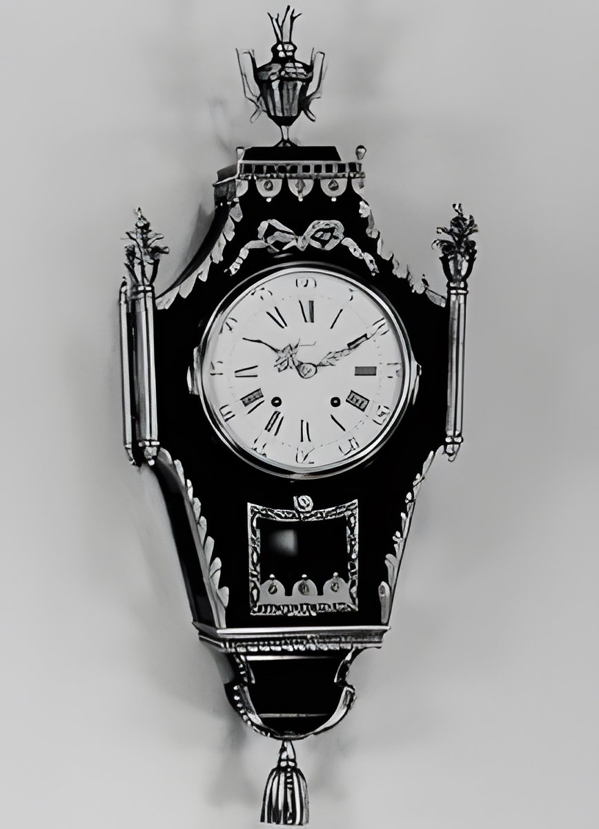 Directory style wall clock with hand-painted limewood cabinet, individually cast bronzes, enamel dial and 8-day movement with hour and quarter strikes. (ZENITH)