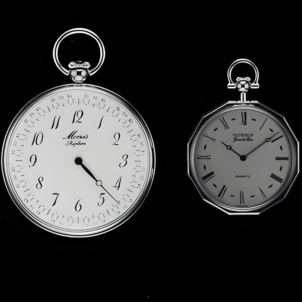 Left, the “Subscription Watch”,a replica of a famed design made by the master watchmaker, Abraham-Louis Breguet, around 1800. The same watch hand shows both the hours and the minutes because “...most people really need only approximate time”. This was Breguet least expensive watch though its quality was naturally beyond reproach. It was sold by subscription hence its name, and made in what for the time were large numbers. 161/2-line calibre, decorated movement, 10 micron goldplated case. Right, extra-slim quartz-piloted pocket watch. Case with 12 gloss-polished sides, black lacquered caseband, champagne dial with painted Roman numerals and faceted applied hour markers. (MOERIS “Replica” - Tissot S.A.)