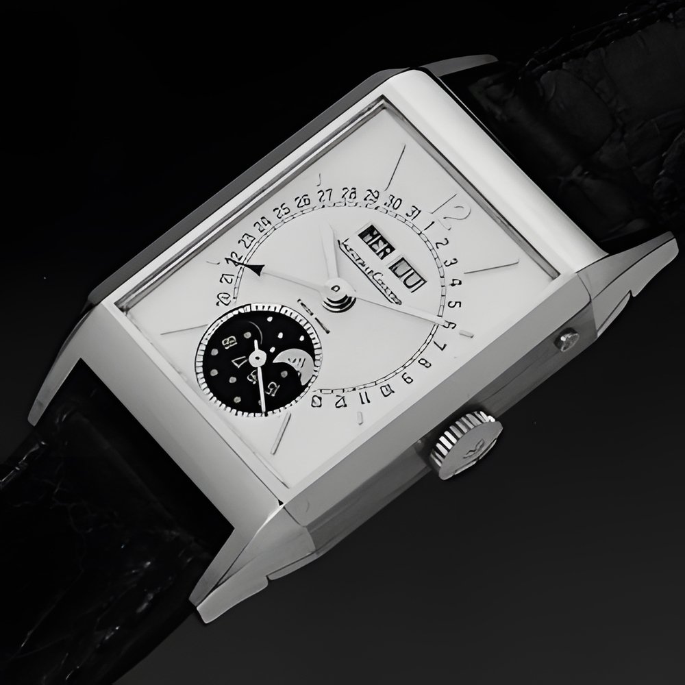 The moon phase watch Jaeger Lecoultre is rectangular and contains an extremely delicate and intricate mechanical mouvement. Its value, far more that than of a mere wrist watch, contributes to its incredible uniqueness. The moon phase watch will be produced in a limited series of 600, all individually numbered. (JAEGER-LECOULTRE)