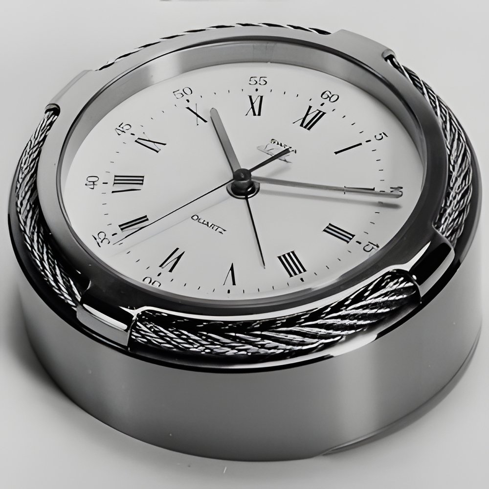 European Watch Clock and Jewellery Fair 1983 BF 601 Clock from the “Sealine” collection. Solid brass case and nickel-plated cable. Quartz movement. with calendar. Ø 100 mm. (SWIZA “Sealine”)