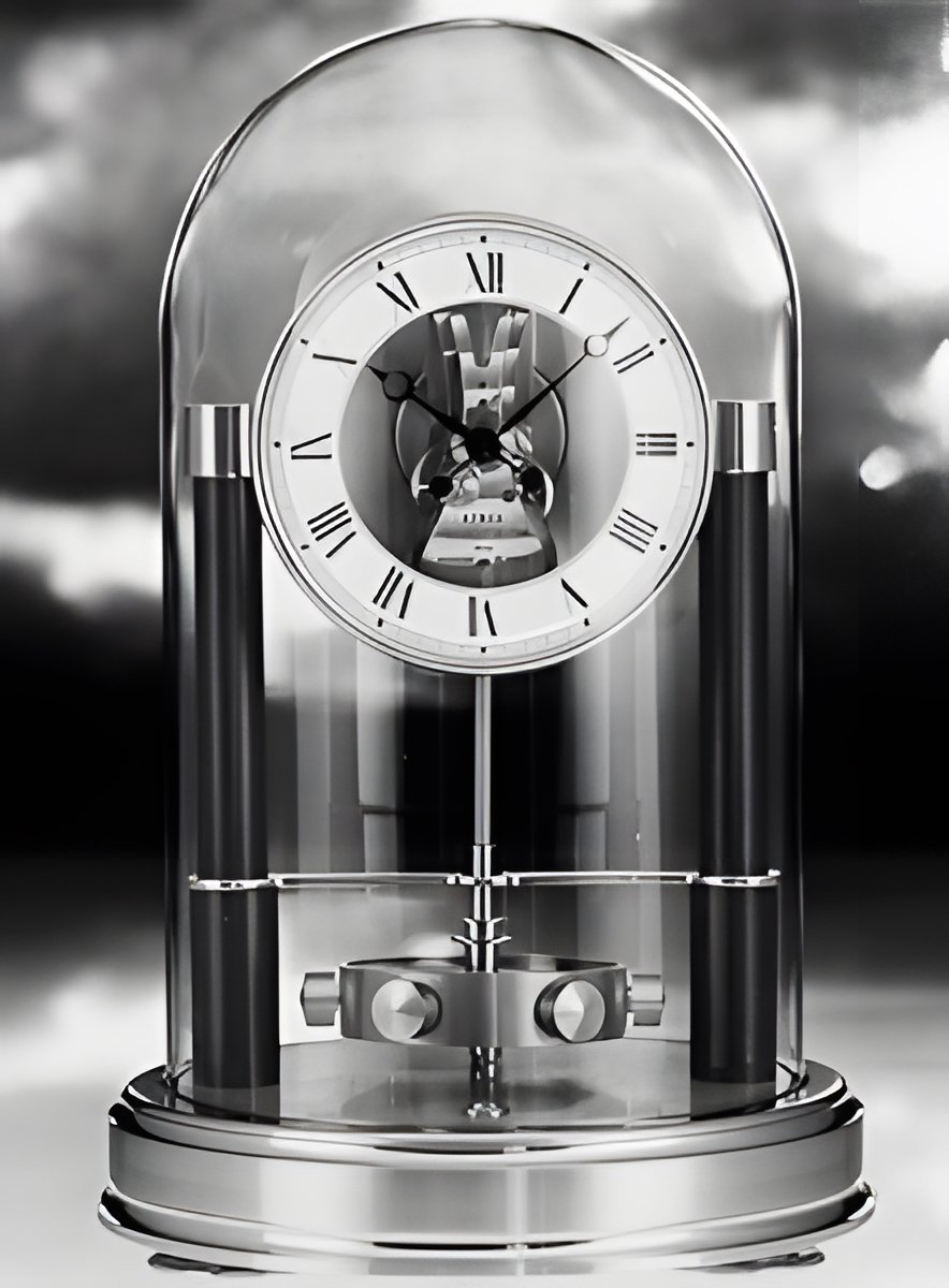 Atmos 150ème is covered by a mouth blown glasglobe. The world famous movement is held in place by black columns and the centre clock rests on a goldplated brass base. The clock face is white, convex and has Roman numerals. The Atmos 150ème is produced in a limited series of 3000, each one numbered and issued with its own certificate of authenticity. (JAEGER-LECOULTRE “Atmos”)