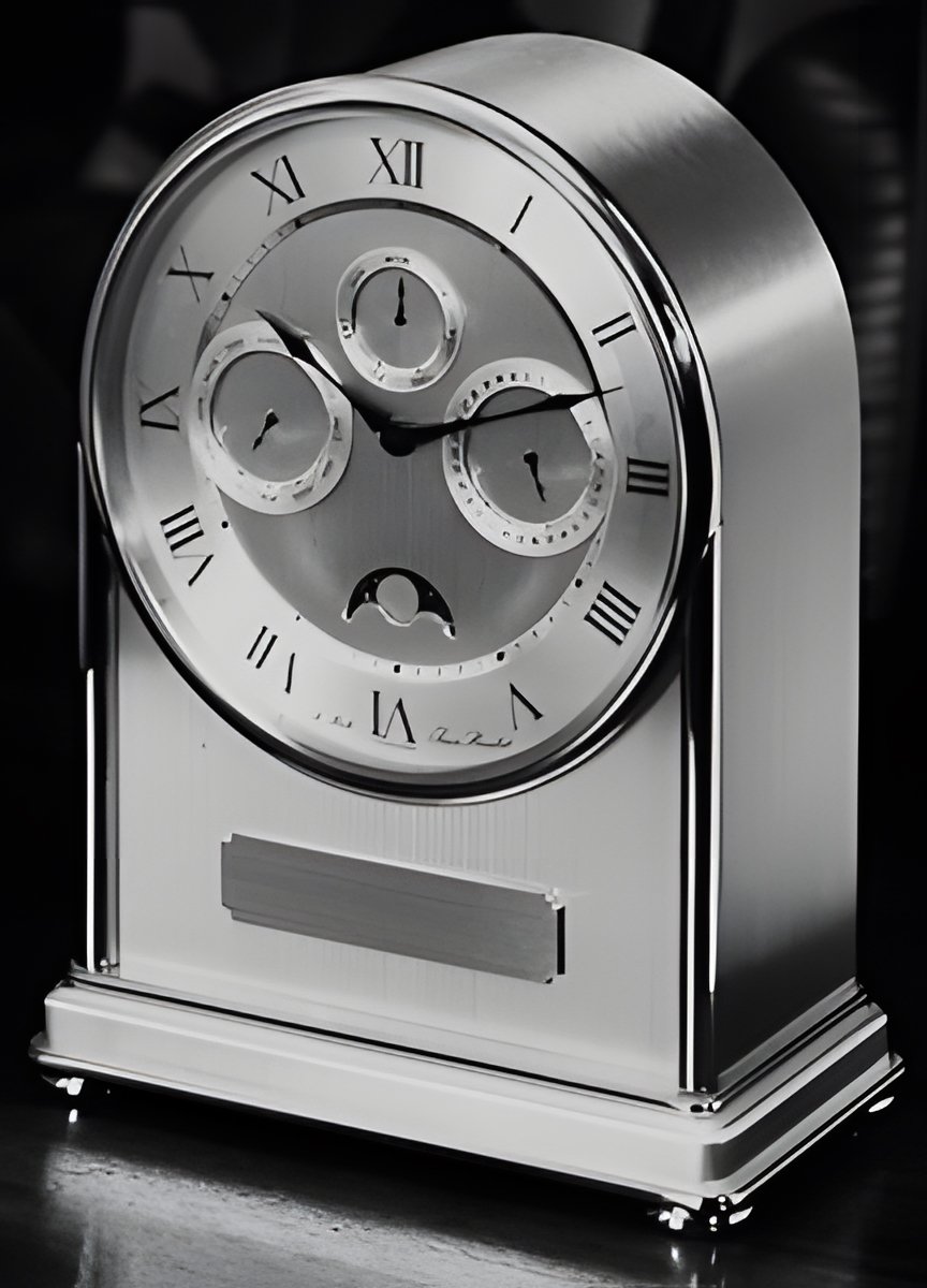 A magnificent table clock with full calendar : day, date, month and phases of the moon. Metal housing with rounded, polished gilt trim and silvered, engine-turned face. Dial with contrasting zones and applied markers. (JEAN ROULET “Fontenay”)