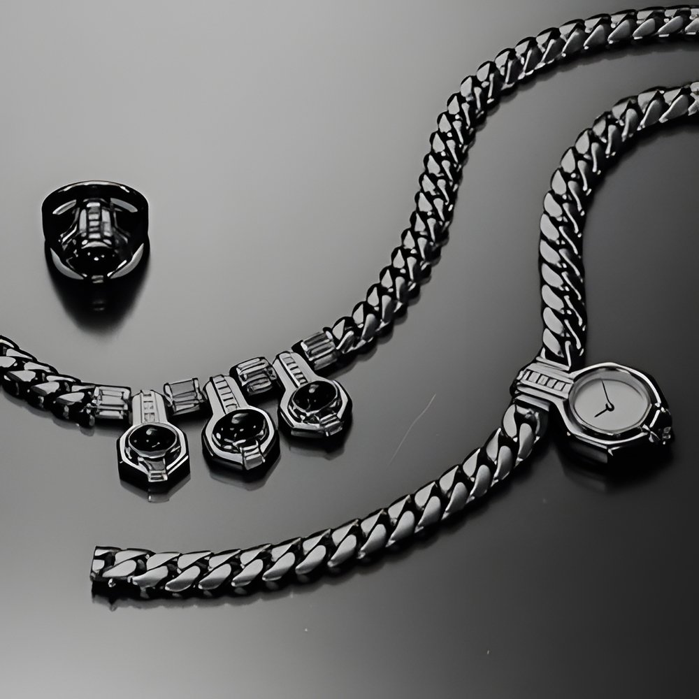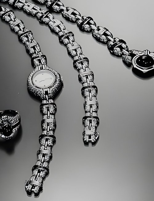 The fashion focus is on chains this year, even at the luxury end of the market. A fine example is this jewellery suite comprising a necklace, earrings, a ring and a wristwatch in white and yellow 18K gold. It features a total of 5.75ct of diamond baguettes and 10.26ct of ruby cabochons. The watch is quartz-piloted. (PRIVILEGE S.A., Geneva)