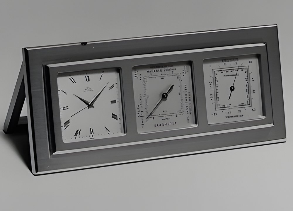 A table clock with a quartz watch (with or without alarm), a barometer and a thermometer. Cabinet in polished brass, specially treated against moisture. This model is also available with three watches (for different time-zones) instead of the barometer-thermometer station. (PONTIFA)