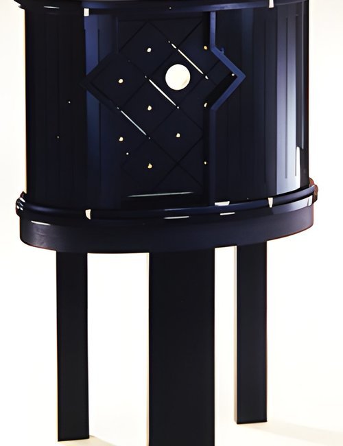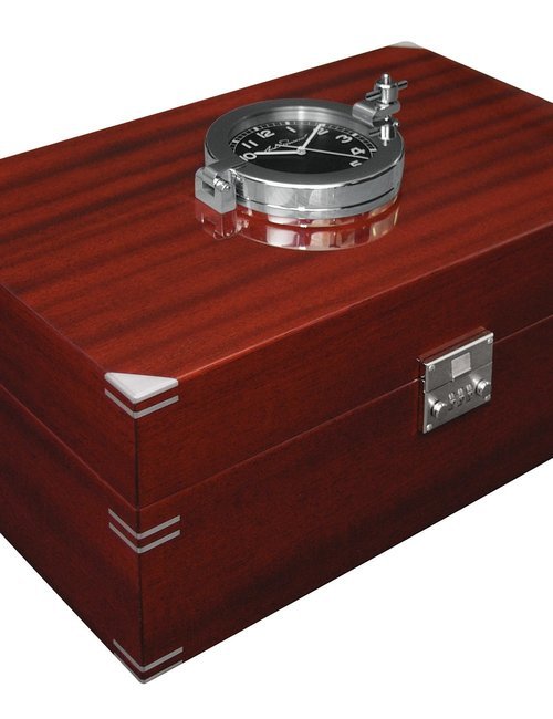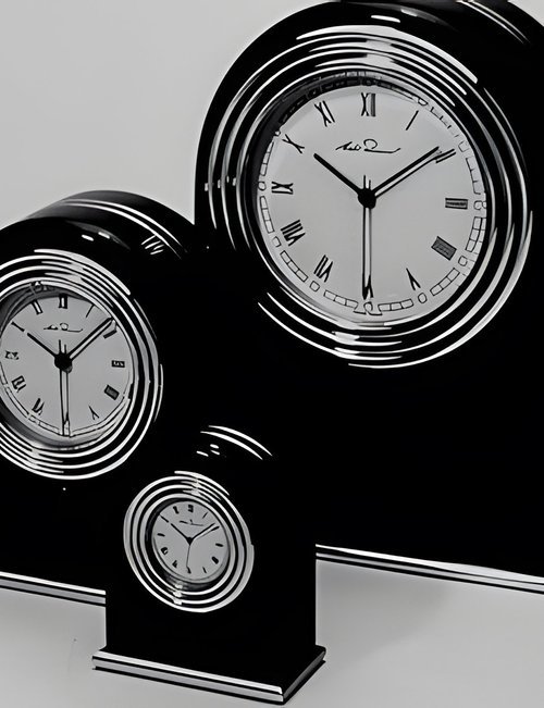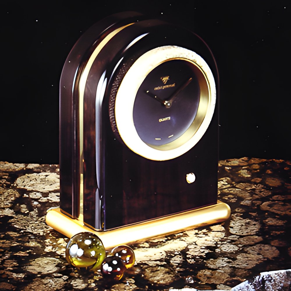A table clock in solid ebony with a golden fillet and a goldplated base. The bezel is paved with 1,000 genuine diamonds, and a 1-carat diamond solitaire is set in the case. Quartz movement with long-life battery. (MICHEL PERRENOUD)