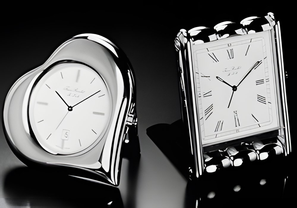 The table clock is ideal for designing original aesthetic shapes. Here are two Jean Roulet models in solid brass “with a thousand glints of gold”. Quartz movements with alarm and date calendar. (JEAN ROULET “Corazon” & “Livet”)