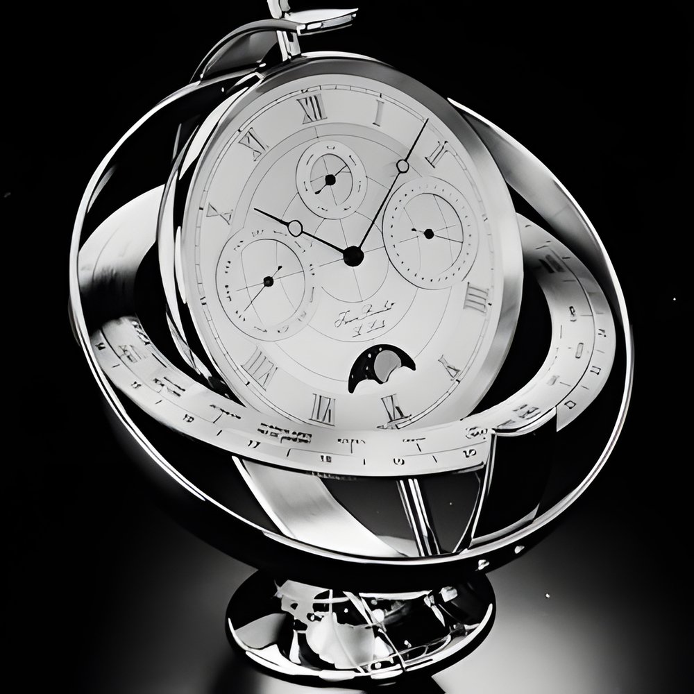 Dedicated to the “Conquest of Space”, this Jean Roulet clock with a multiplicity of rings features a perpetual calendar showing the date, day, month, moon phases and shows local time all over the world. Luxurious finish in gilded brass. Quartz movement. (JEAN ROULET “Saturne”)