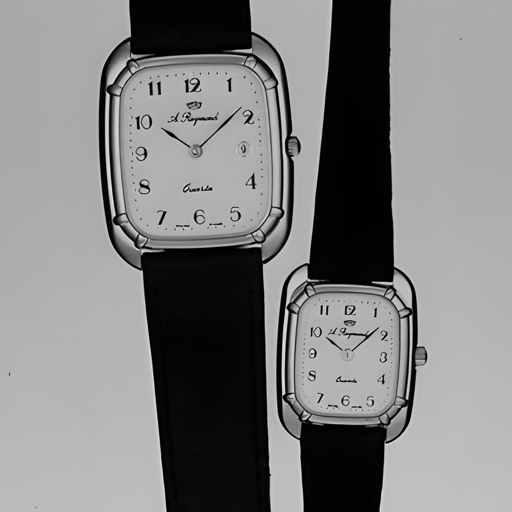 Very slim and graceful watches for men and women. Showerproof chromed cases with goldplated bezel and steel back. Flawless wedding of the leather strap to the case. Extra-thin quartz movements with date calendar. (A. REYMOND - J. Choffat S.A.)