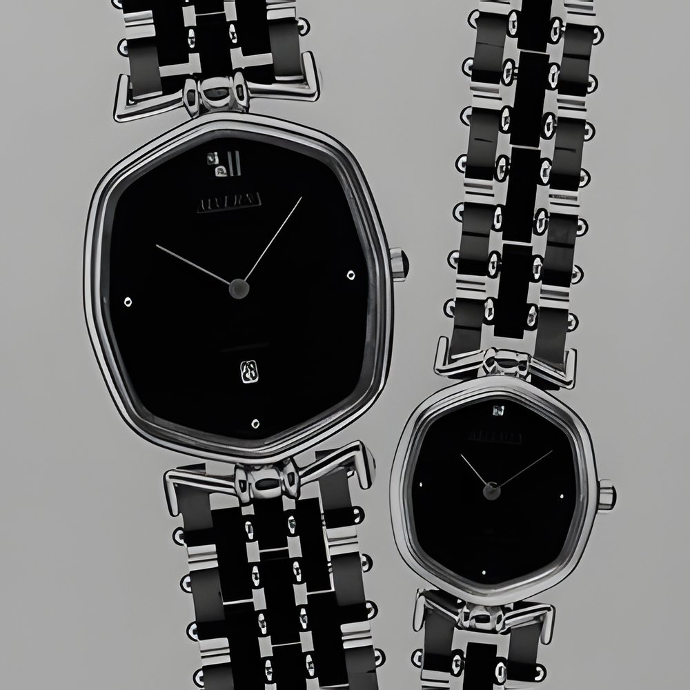Geometric lines : octagonal opening in a rectangular case band. Black, champagne or pearl-grey dials set with cut crystal. Undulating and chatoyant bracelets. Extra-slim ETA Flatline quartz movements. Sapphire crystals. Water-resistant cases in 10 micron goldplate. (ARDATH-ALVERNA, Dreyfuss & Cie, Geneva - “River”)