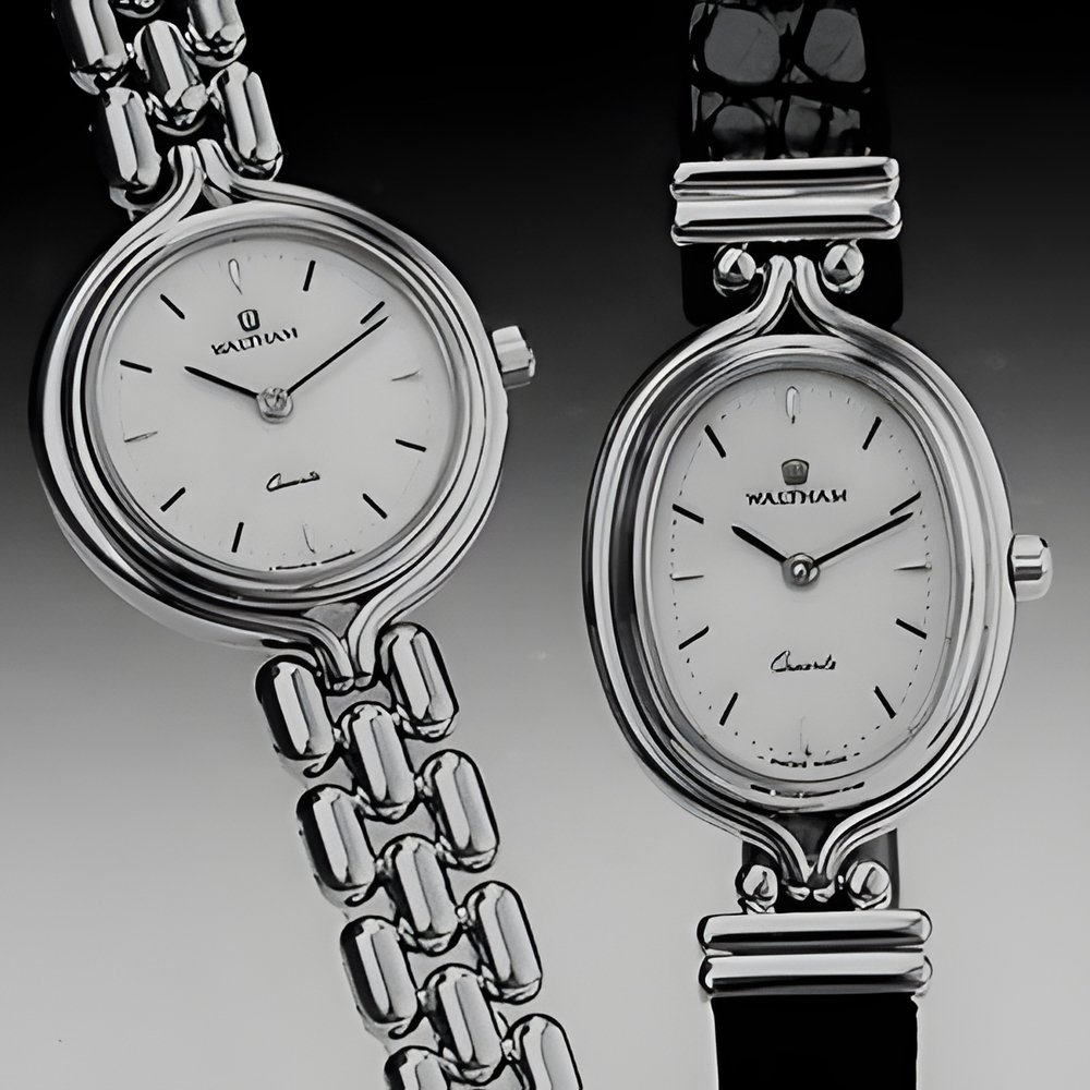 Graceful feminine models. Water-resistant to a depth of 30 m. Round or oval cases in 10-micron goldplate. Bracelets in leather or goldplate. Scratch-resistant sapphire crystals. ETA Swiss Quartz movements. (WALTHAM)