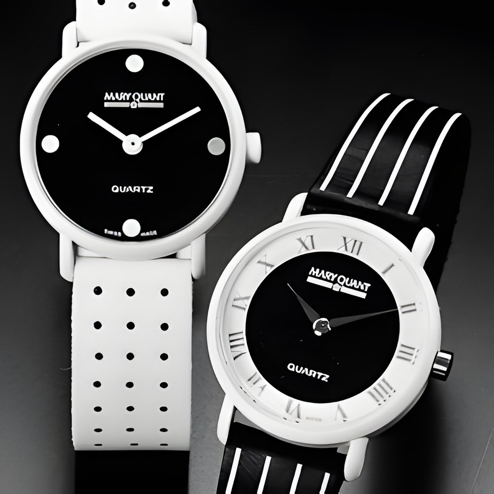 The miniskirt and Mary Quant are back again in 1986 with a collection of very trendy watches. Metal cases in vivid colours, water-resistant or showerproof. Bold dials, striped or spotted bracelets. Quartz movements. (SOSCLAN LTD. - MARY QUANT)