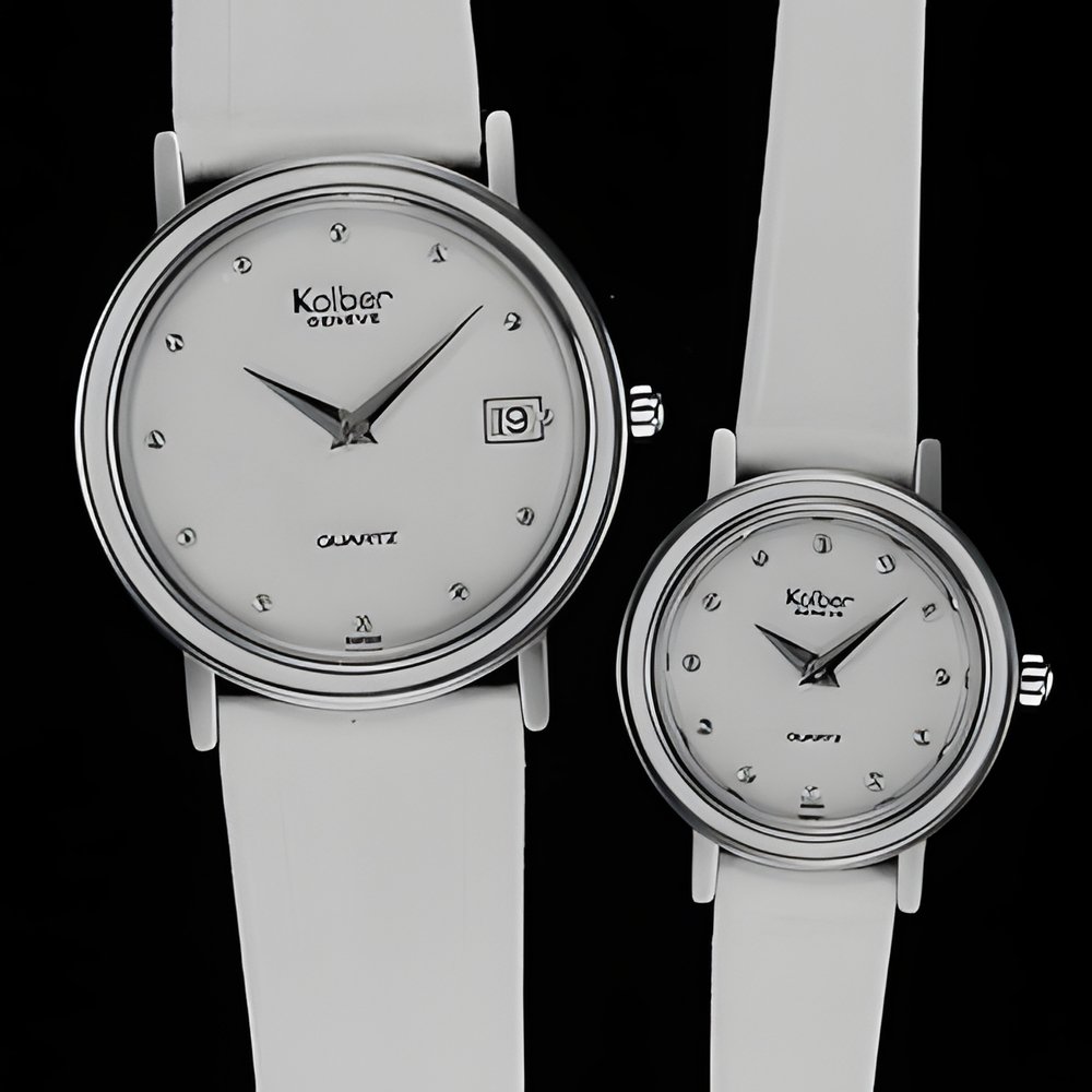A pair of classic quartz watches, but with two “trendy” features white-lacquered bezels and hour-symbols made of artificial stones. Water-resistant goldpiated cases. (KOLBER)