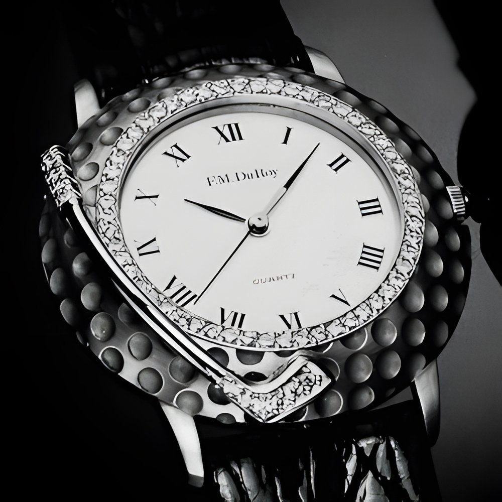 An ultra-chic sports watch for golfers. In 18-karat gold, embellished with brilliant-cut diamonds, the case - chased in the shape of a golf ball - is adorned with .a diamond-studded golf-club. Quartz movement. (NOW SA - F.M. DuRoy “Golf”)