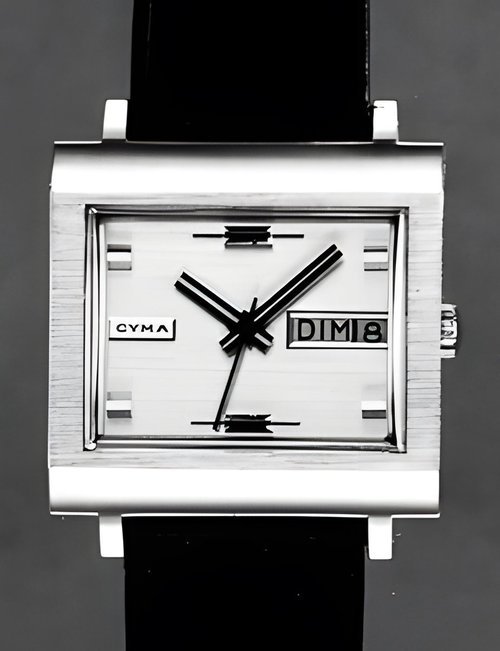 This Cyma watch is available in both feminine and masculine models. It features a “cambered square” case, a dial with Roman chapters and an extremely flexible bracelet composed of a multiplicity of small articulated links. Water-resistant, this watch is only 3.6 mm thick (with the Cyma 131 quartz movement : 1.2 mm high). Available in 18K gold or in goidpiate. (CYMA)