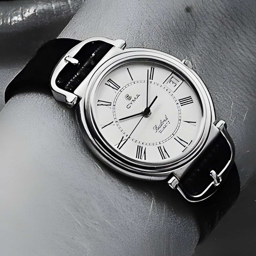The leather strap of this extra-slim quartz watch from Cyma is linked to the water-resistant case by a highly original “mobile attachment”. Centre seconds hand and date calendar. Comes in two sizes : for women and men, in goidpiate or in steel. Cyma 117 quartz movement. (CYMA)