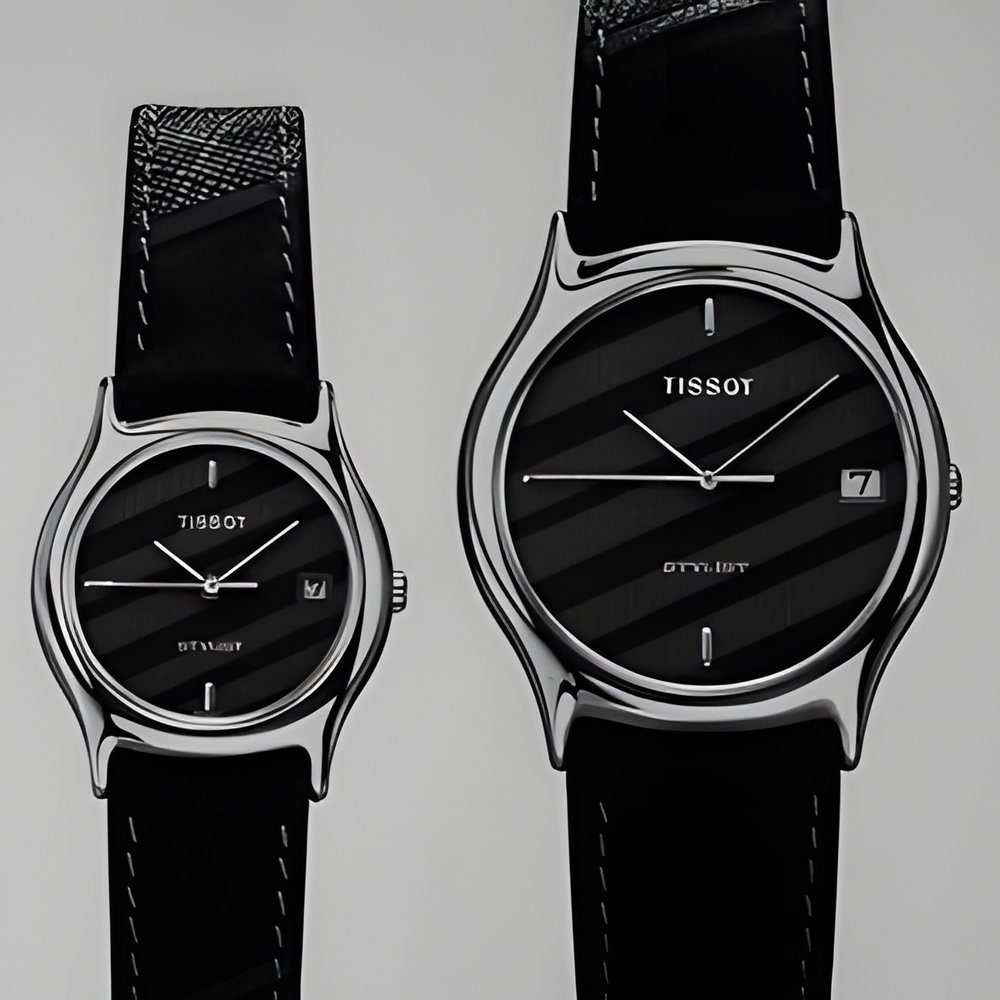 European Watch Clock and Jewellery Fair 1986 BF 147 “Fashion”, today’s fascinating and fashionable design look. Ultra-slim and water-resistant. The face melts into the bracelet itself. Case in goldplate and black goldplate. (TISSOT “Stylist Fashion”)