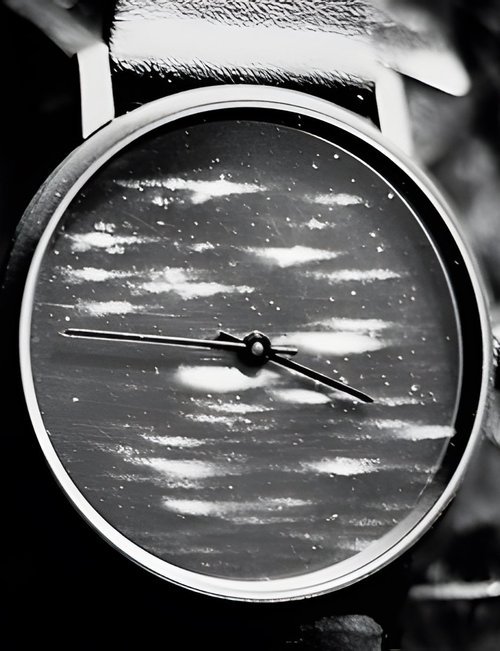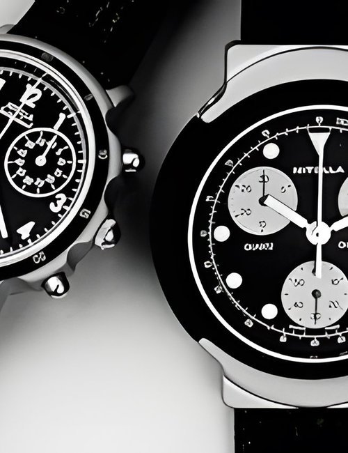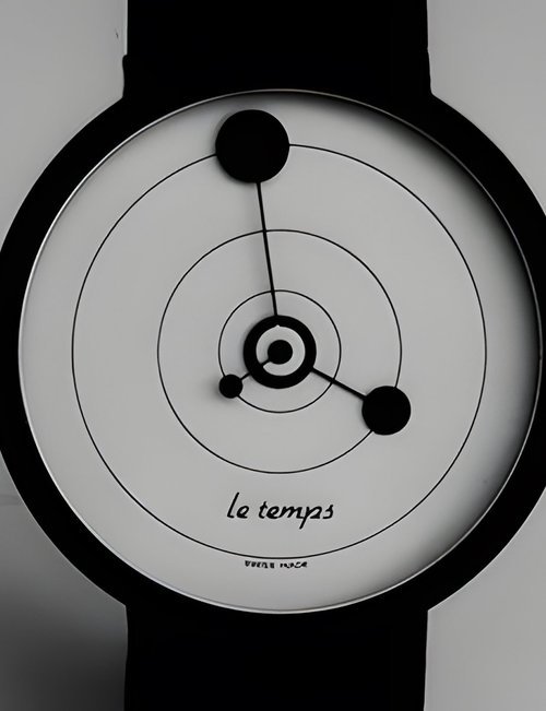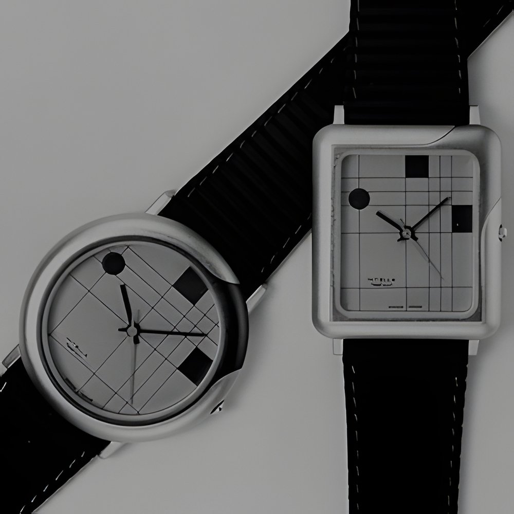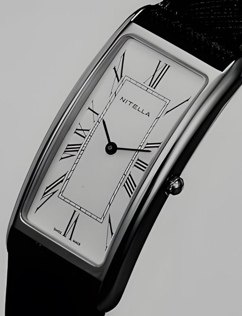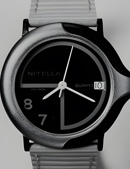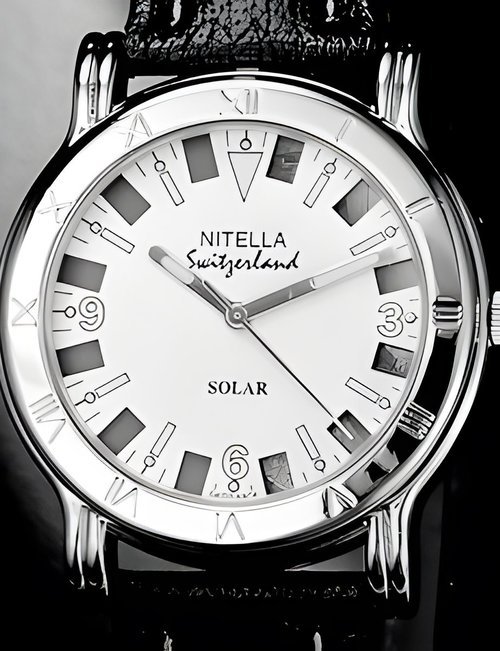 Bright, pert and youthful - a two or three colour design with steelbacked aluminium case water-resistant down to 30 m. Geometric patterns on the dial and rubber bracelet. Quartz movement. (NITELLA)