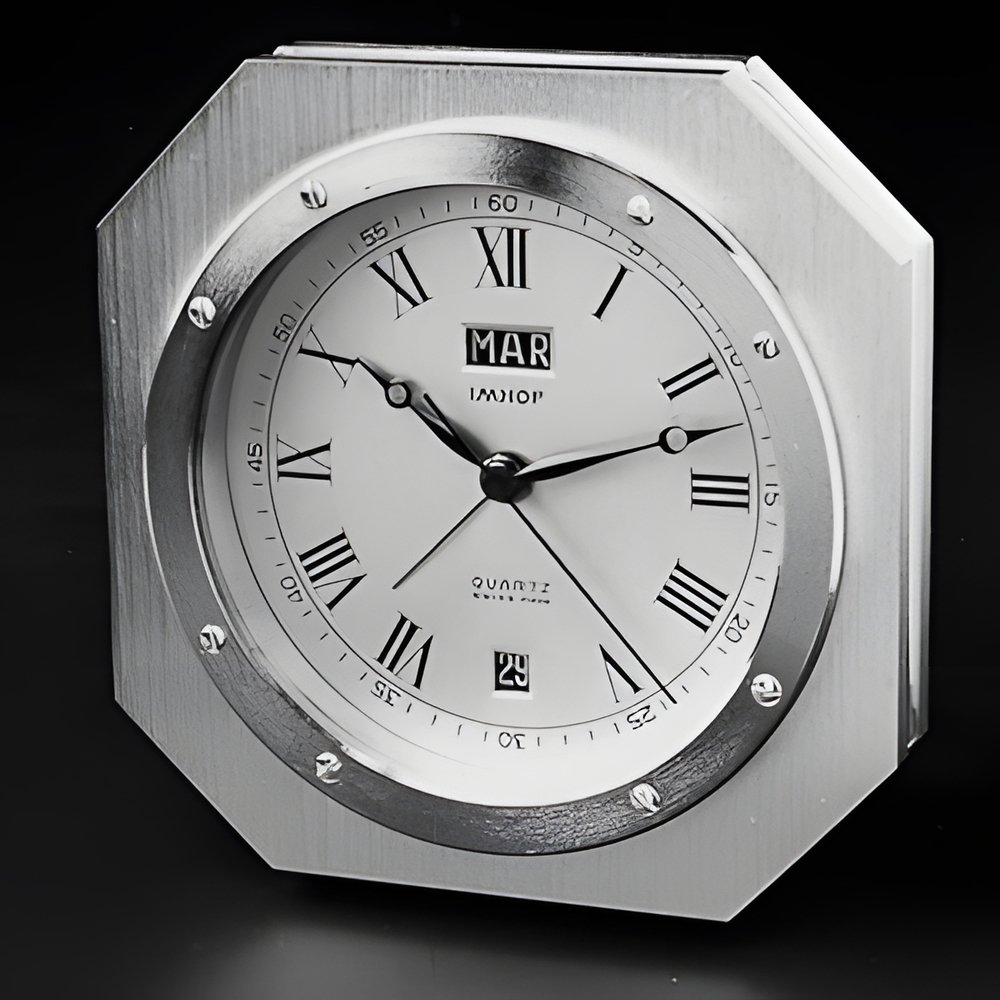 This small table clock features a new Imhof quartz movement of absolutely unique desing. Frequency 4MHz (exactly 4,194,304 vibrations per second) with centre seconds, day-date calendar and modulated alarm. Typically horological round movement with integrated battery: ø 54 mm and 13.3 mm thick. Time and alarm settings by the same button. Gilt case in solid brass, bezel with visible screws. (IMHOF Quartz)