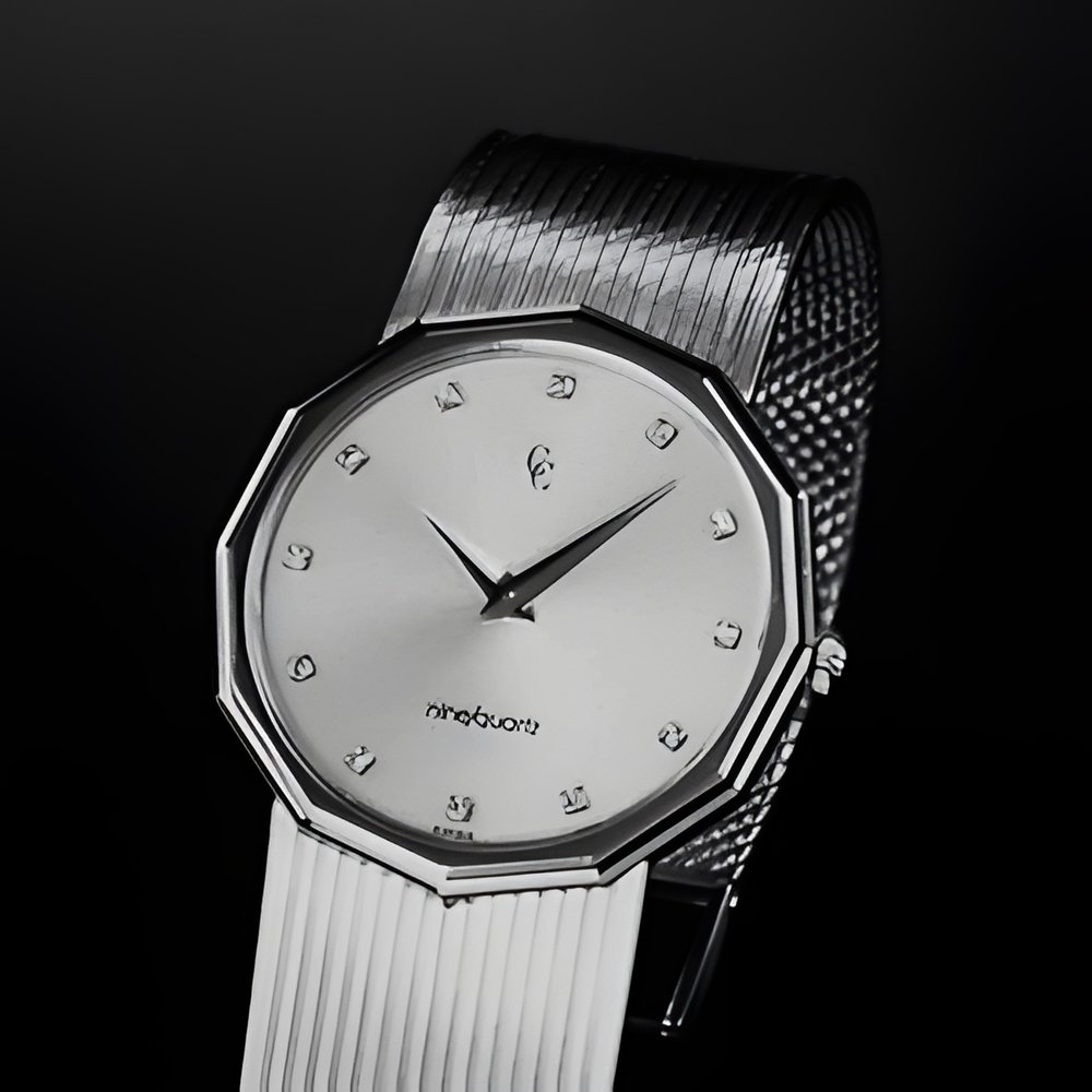 A Concord design in 18K gold from the new “Nine-Line Quartz” series, notable for extremely thin case profiles (less than 4 mm) thanks to the wafer-thin (1.63 mm including battery) quartz movement inside. 12-sided bezel, dial. set with 12 round diamonds. Gold bracelet. (CONCORD “Nine-Line Quartz”)