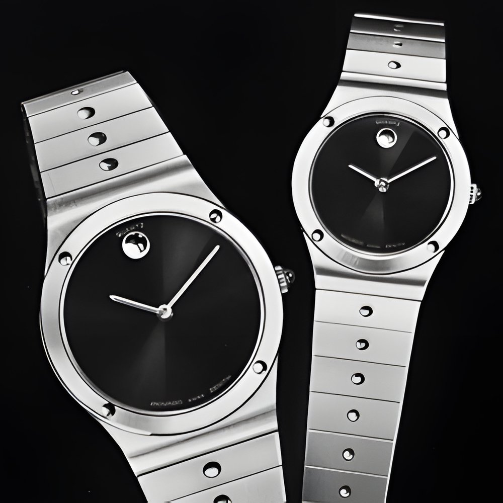 Two exclusive His and Hers models inspired by a design selected for exhibition by the Museum of Modern Art in New York. Integrated bracelet and case with small, yellow goidpiated concave inserts. Black dial, sapphire crystal. Case water-resistant to 30 meters. Extra-thin quartz movement. (ZENITH-MOVADO “Modern Art”)