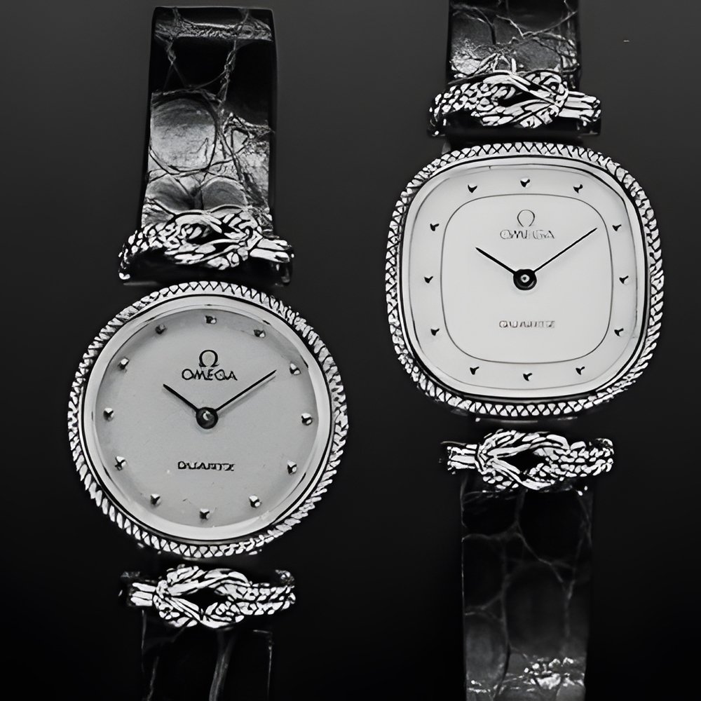 Two ladies’ 18K gold watches, with quartz movement. Delicate bicolour “jewellery knot” attachment pieces. Bezel encircled with twisted thread, frosted gilt or ivory dial, 12 cabochons. Scratch resistant sapphire crystal. Registered models. (OMEGA Quartz)