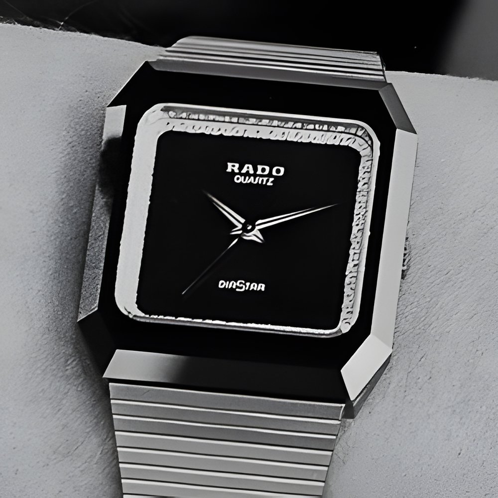 Introducing the new Diastar 116 by Rado : understated elegance embodied in a bevelled case made of an alloy of tungsten carbide and titanium that is practically scratchproof. The decor on the inner bezel is made of the same metal. Water-resistant. Scratchresistant sapphire crystal. Quartz-movement. (RADO Diastar 116)