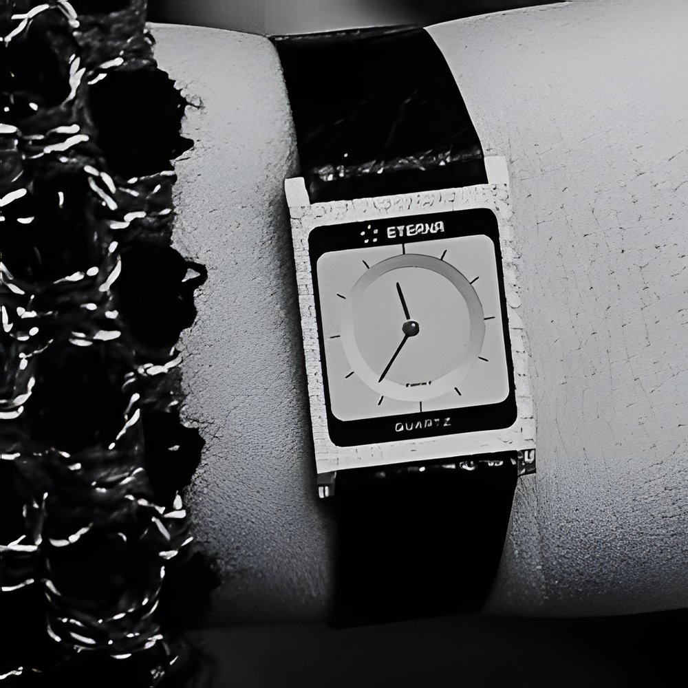 Elegance in miniaturisation - Eterna present their newest marve]. built around the just-developed “Delirium” lady’s quartz calibre. It incorporates the constructional concepts and technology which was first introduced in the world’s thinnest man’s watch (1.98 mm) total integration of case, movement and dial into a functional whole. But now, the volume has been reduced by 45%, the better to fit a graceful feminine wrist, and its thickness is down to an incredible 1.68 mm ! The case is yellow gold with chequerboard engraving. (ETERNA)