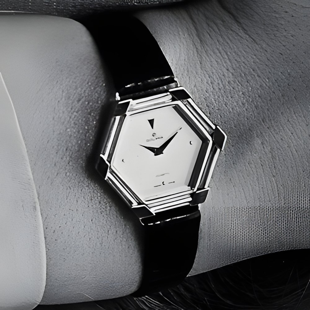 An original design by Golana - six-sided fluted case in 18K yellow gold highlighting platinum lozenge-shaped angles. Champagne-coloured dial, gold hour markers. Extra-thin “Flatline” type movement. A registered model made by traditional craft methods. A silver-and-vermeil and a man’s versions are also available. (GOLANA “Arabelle”)