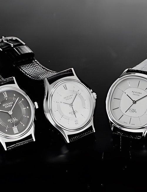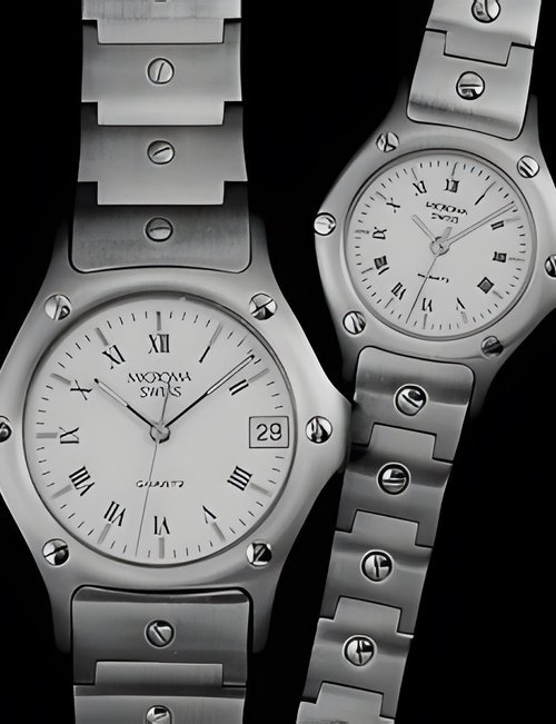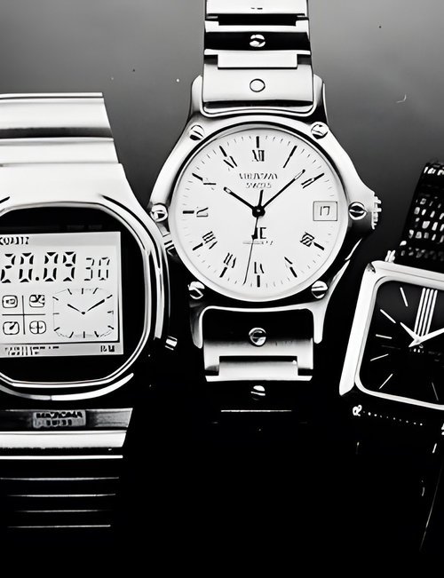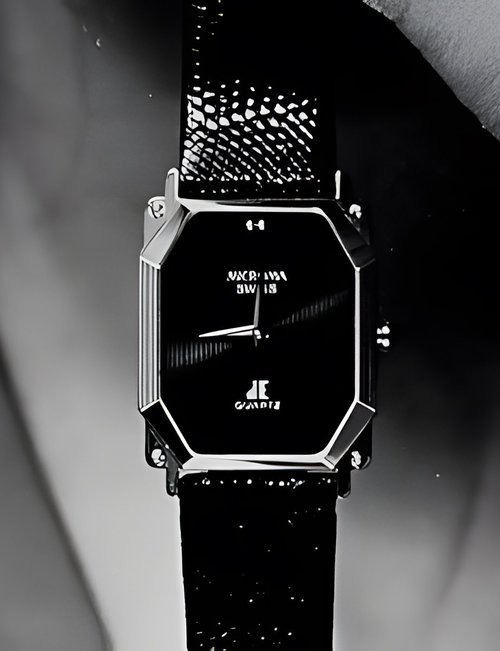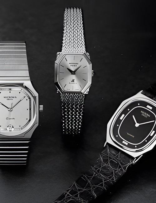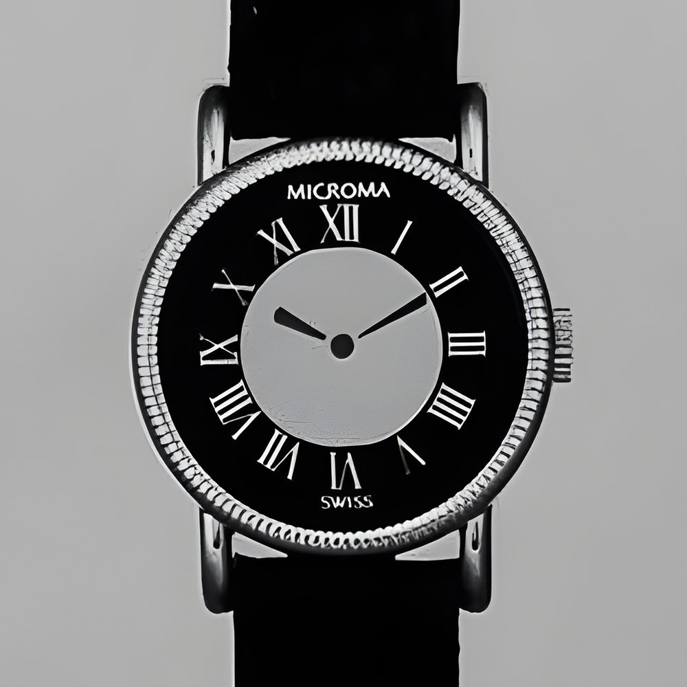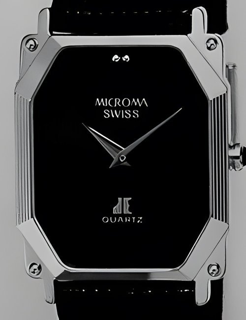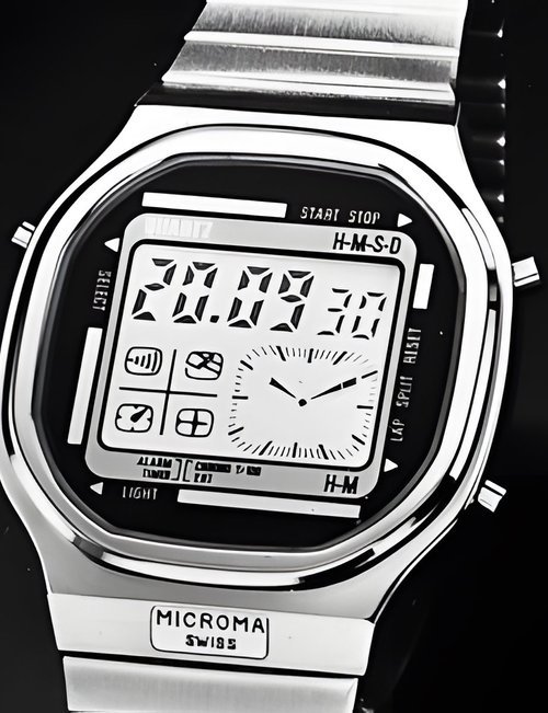 A lady’s model fitted with the new solid-state analogue quartz calibre with liquid crystal “hands” (ESA-EEM 932.051). Seconds are indicated by four winking dots. The display’s goldcoloured reflector provides excellent contrast. Reed-pattern, round goldplated case with metallized mineral crystal. (MICROMA SWISS “Golden Quartz”)